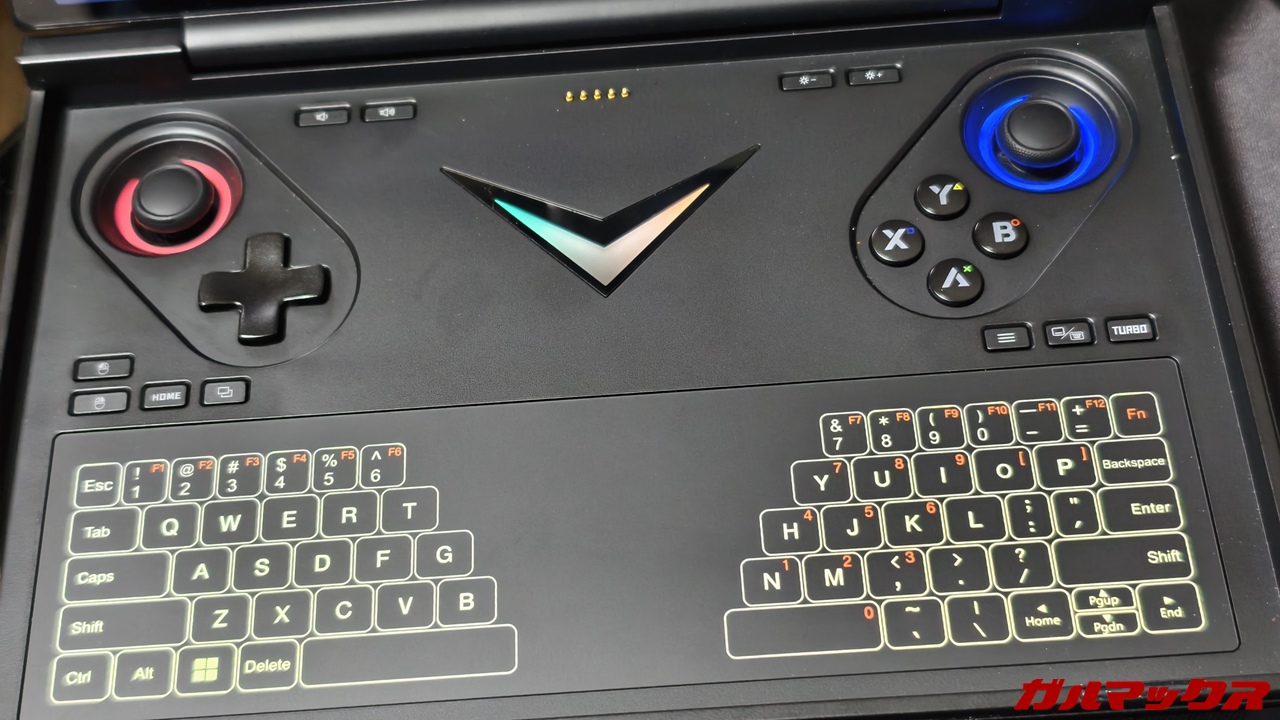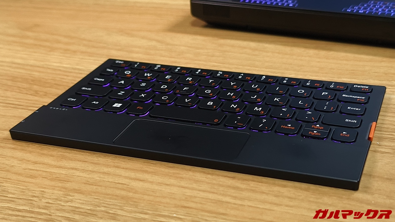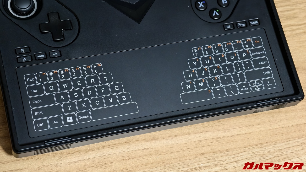 ▼コントローラー部分の下に控える大型タッチパッドはキーボード入力も可能なタイプ。キーピッチは非常に小さくタッチタイプなので文字入力は慣れが必要です。ゲーム中にちょっとしたチャットの返信くらいが関の山で長文はキツイです。↓