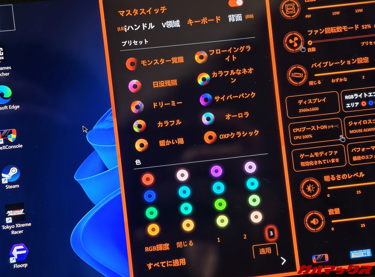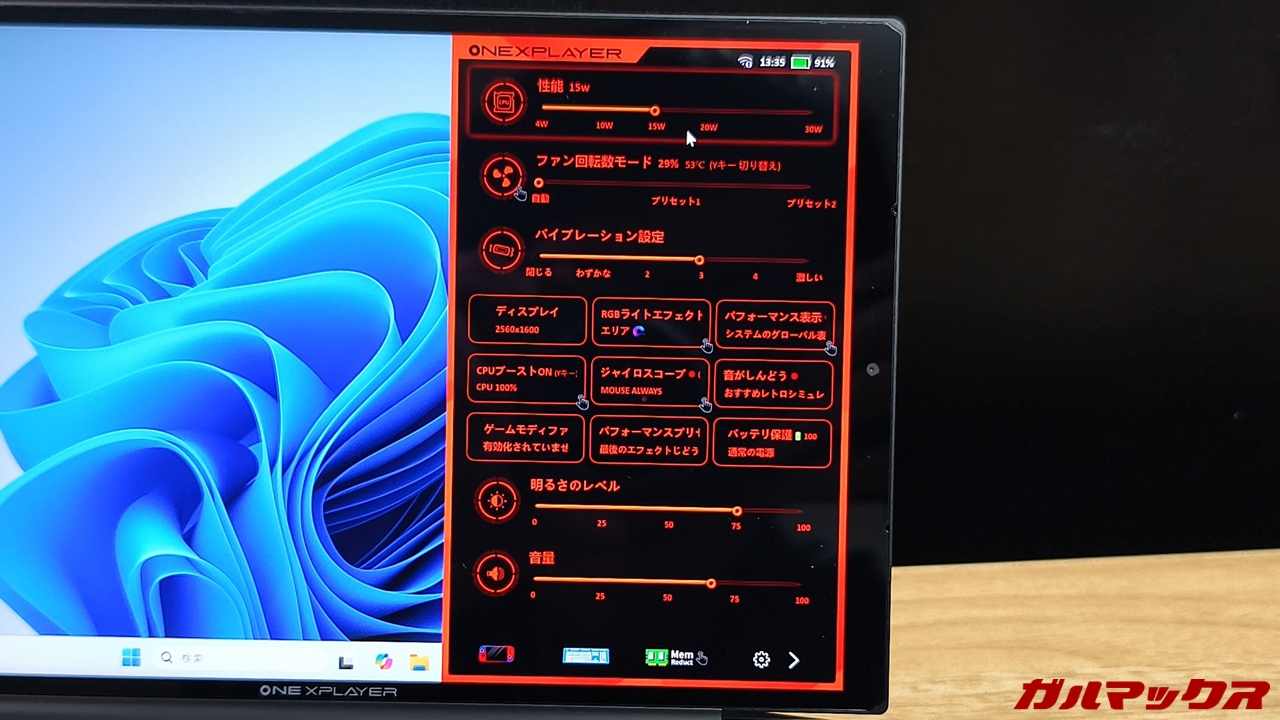 インターフェースデザインは直感的に扱えてけっこう良い。パッド操作できるのもGood。また性能のW調整、ファンの回転数と温度のコントロールやライティング、またサウンドの大きさに応じて振動したり、バイパス充電の有効化といったゲーミングデバイスにふさわしい機能も充実。