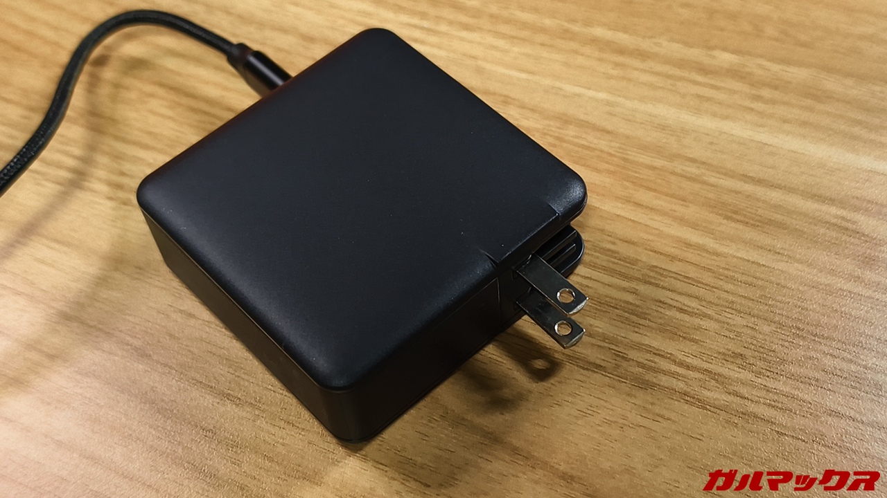 ▼充電器はそこそこ大型、しかし厚みを抑えて角にかけて丸められており、プラグも格納可能!携行性を高めているのは非常に嬉しいですね。出張先にも持っていきやすいです。↓