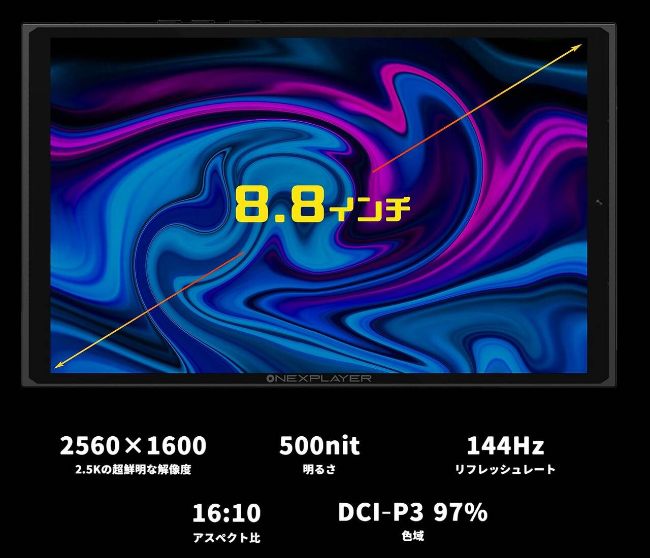 ▼ディスプレイはサイズが8.8インチに小型化。一方で解像度とアス比はそのまま維持し、最大リフレッシュレートは144Hzにアップグレードされているのが特徴です(X1は120Hzだった)。↓
