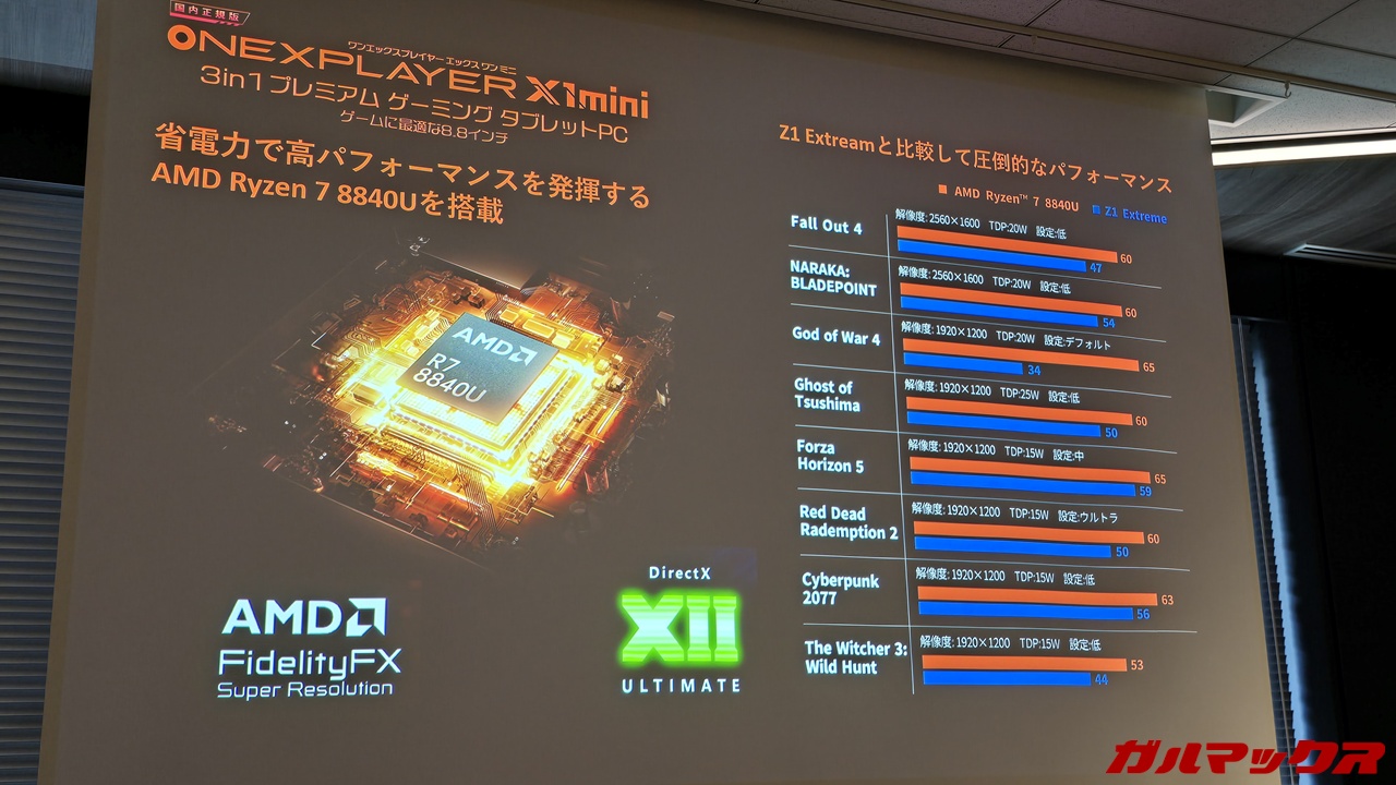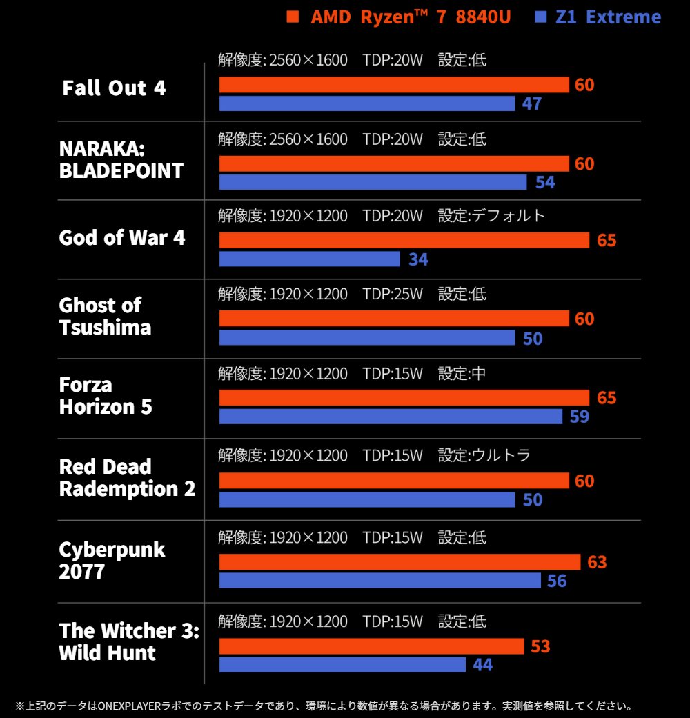 ▼ROG ALLYに搭載されているRyzen Z1 Extremeよりも高い電力効率とゲーム性能を持ち合わせています。世紀末オープンワールドのFallout4でさえも60FPS出せるとのこと!低プリセット画質にはなるものの、ハンドヘルドでもあのクソ重ゲーが出来るって夢だよマジで。↓