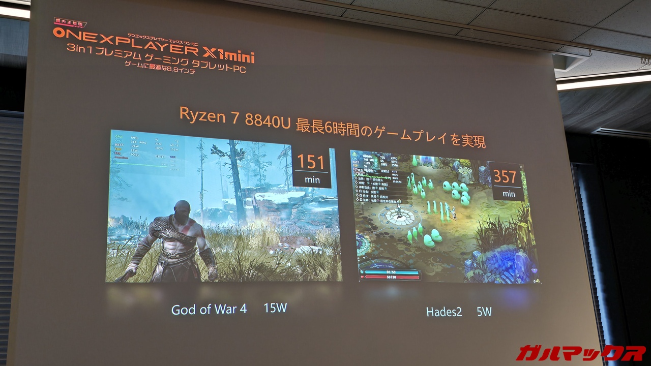 ▼バッテリー容量は16890mAh(65.02Wh)。ゲームによりますが、3DゲームのGod of War 4では2時間半ほどプレイができるとのこと!もっと軽いゲームならそれ以上で、最長6時間も遊べるんだそう!↓