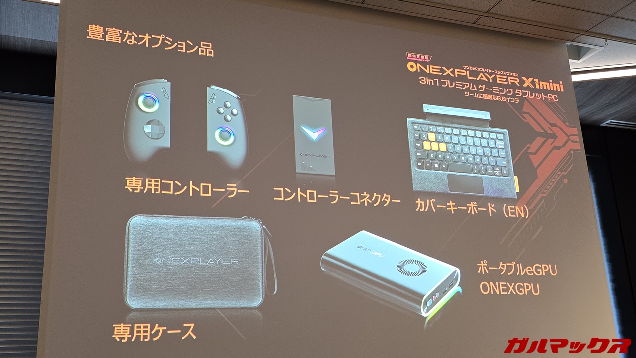 ▼対応アクセサリーは以下の通り。X1同様に外付けGPUであるONEXGPUも対応していますよ!あと、コントローラーやキーボードは別売りのオプションとなりますので注意っす。なおコントローラーはX1と共通なのでX1のものがそのまま使えます。↓