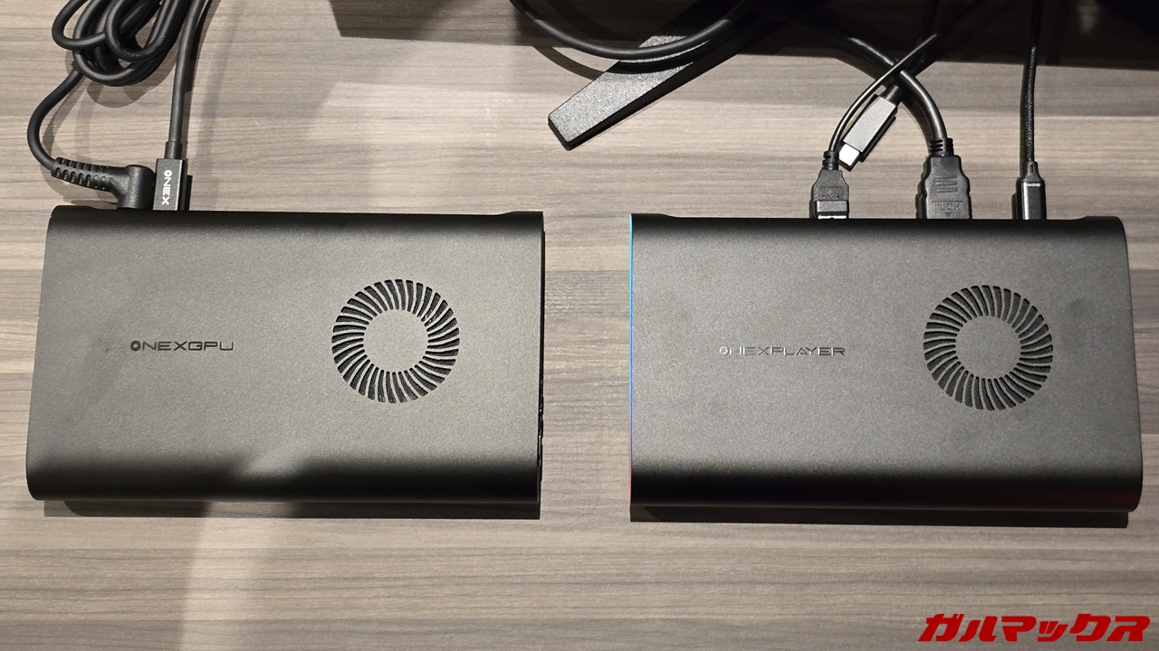 ▼見た目に既視感を覚えた方も多いでしょうけどそれもそのはず、外付けGPUのONEXGPUの筐体と同じなんすよ。並べると非常にクリソツ。双子レベルです。↓