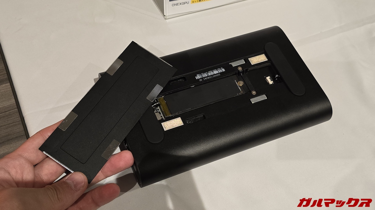▼また、裏面にM.2 SSDスロットが内蔵されています。このポートの蓋はマグネットでくっついてるという面白い仕様!とはいえ換装にはドライバーが必要なのですが‥↓
