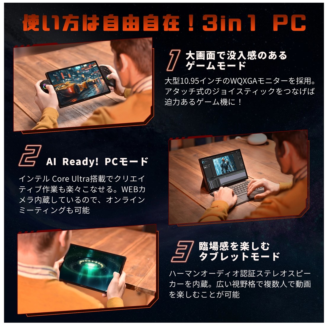 ▼ONEXPLAYER X1は3in1タイプのゲーミングPCで、タブレットスタイル、ノーパソスタイル、ハンドヘルドゲーミングスタイルの3つのモードを楽しめるよくばりセットの塊みたいなデバイスなんすよ。仕事からゲームまで幅広く楽しめそう!遊び尽くしたい。↓