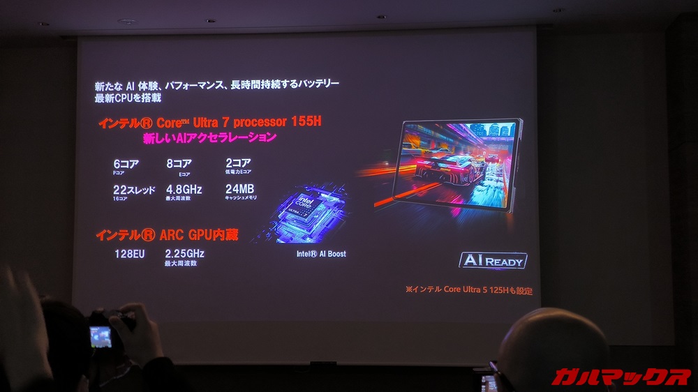 ▼CPUはインテル製の最新CPUであるIntel Core Ultra 5 125H / Intel Core Ultra 7 155Hを採用!GPUはIntel Arc graphics。最大クロック数2.25GHzで駆動するチップでモバイル向けとしては結構なスペック。↓