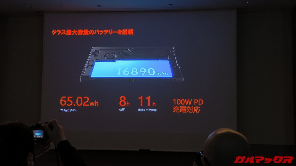 ▼バッテリー容量は大画面だけあってデカめ。16,890mAhとなっています。仕事で使う場合8時間、動画視聴だと11時間もつとのことでした。↓