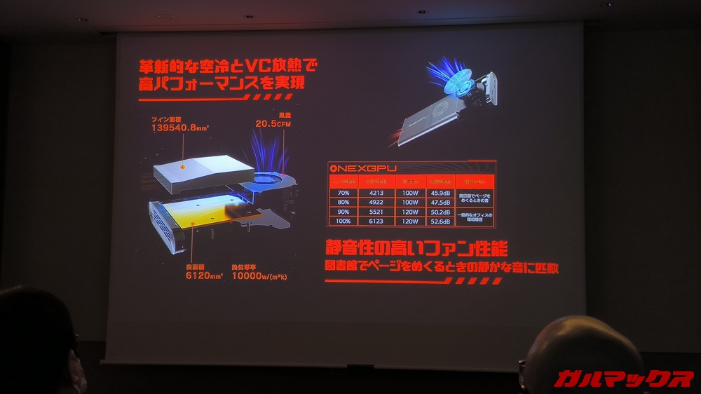 ▼冷却機構はファンとベイパーチャンバーを組み合わせた方式。ファン自体の静粛性は高負荷時でも52.6dBだそうです。カフェとか普通の会社のオフィスまでなら気にならなさそう。↓