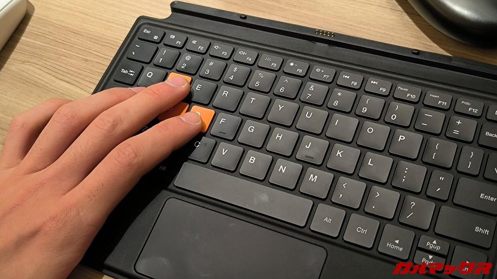 ▼押し心地はカバーキーボードらしくやや軽めな感じ。ただキーピッチがノーパソのそれに近く、ブラインドタッチがやりやすかったのが高評価!11型という大きさゆえの恩恵、効いてますね(`・ω・´)。↓
