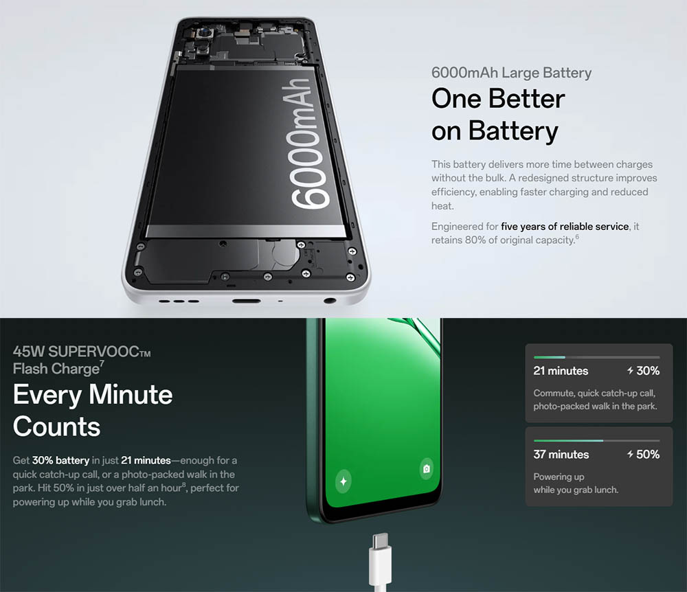 ▼バッテリー容量は6000mAhで、45W(SUPERVOOC)や33W(PPS)の急速充電に対応しています。45W充電時は21分で30%、37分で50%の充電が可能です。5年経過後も元の容量の80%を維持できるそう。↓