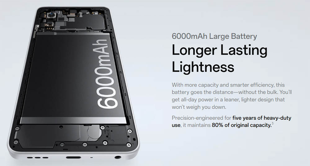 ▼バッテリー容量は6000mAh。45W(SUPERVOOC)や33W(PPS)の急速充電が可能。45W充電時、19分で30%、36分で50%の充電が可能です。5年経過後も元の容量の80%を維持できるそう。↓