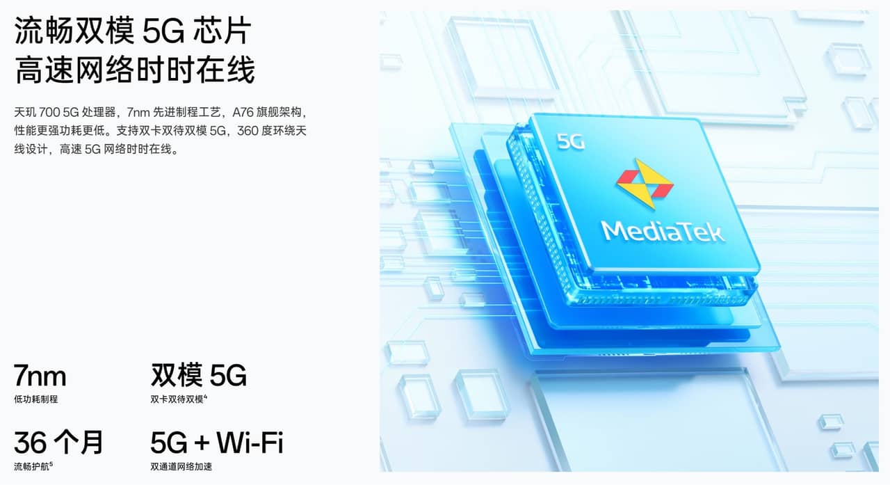 ▼SoCはDimensity 700を採用しておりミドルハイクラスの処理性能で5G通信にも対応しているチップセットです!メモリ(RAM)は8GB、保存容量(ROM)は256GBで大容量。↓
