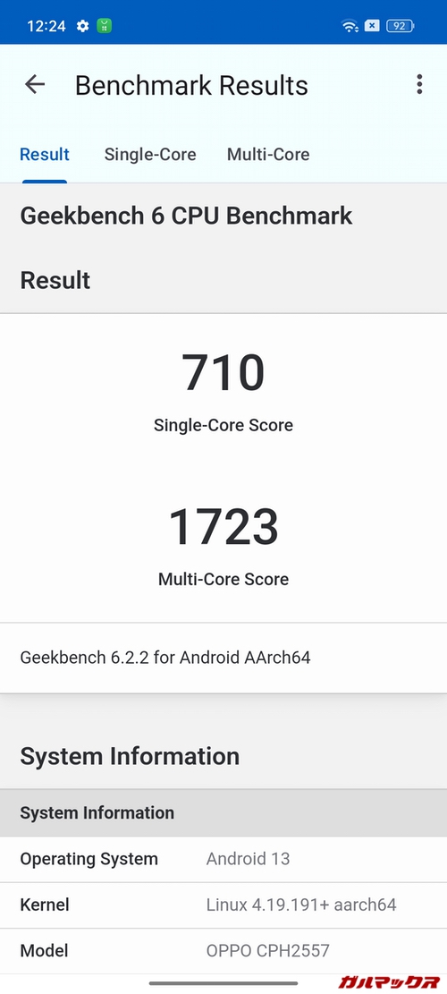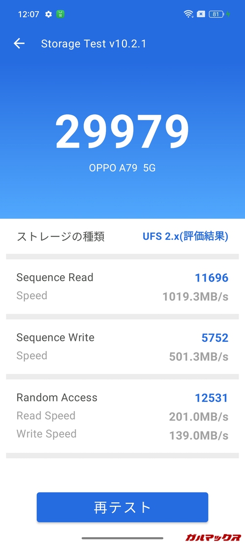 OPPO A79 5Gが搭載するSoCはDimensity 6020。メモリは4GBでストレージは128GB。まあ見るからにエントリーな感じだけれど結構パワフル。AnTuTuスコア的には総合性能は少し前のミドルレンジくらいはあるのだ。