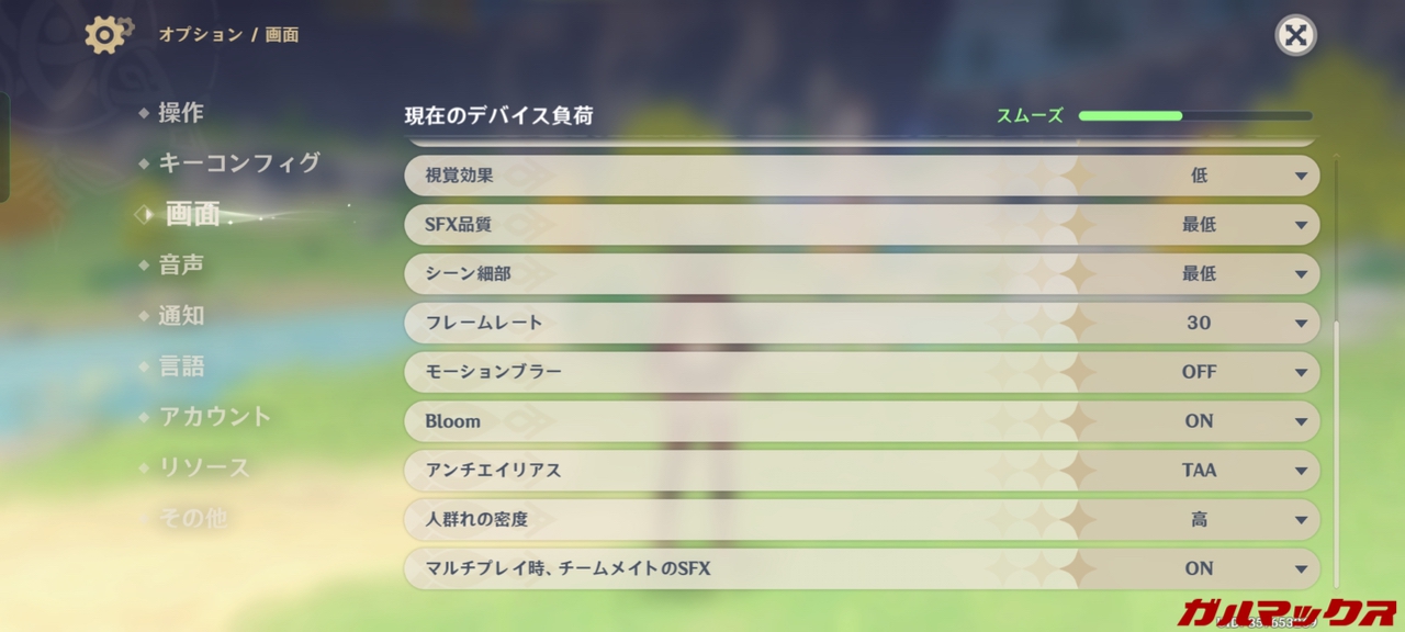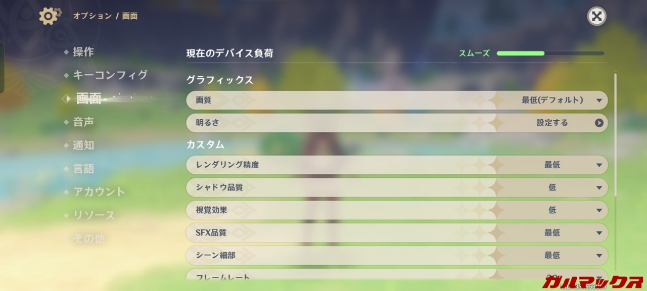 ▼原神のデフォルト設定は「最低」。↓
