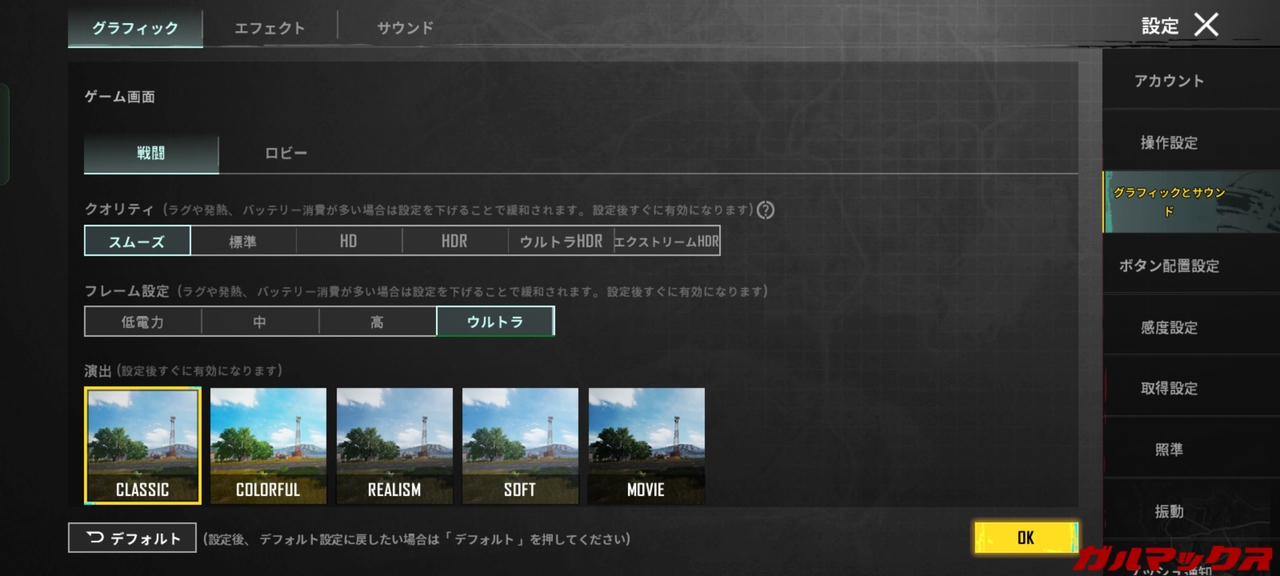 ▼PUBGモバイルはスムーズ+ウルトラ(上限40FPS)でのプレイが可能。↓