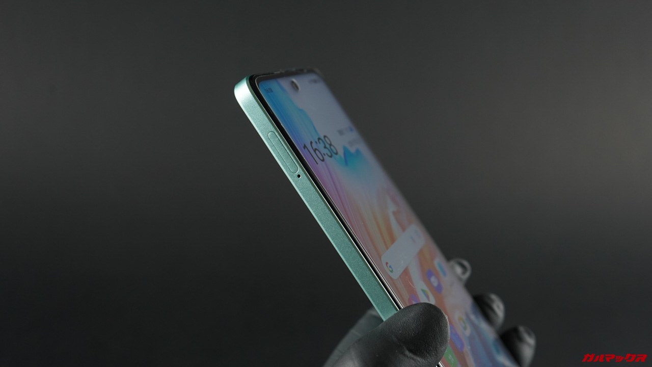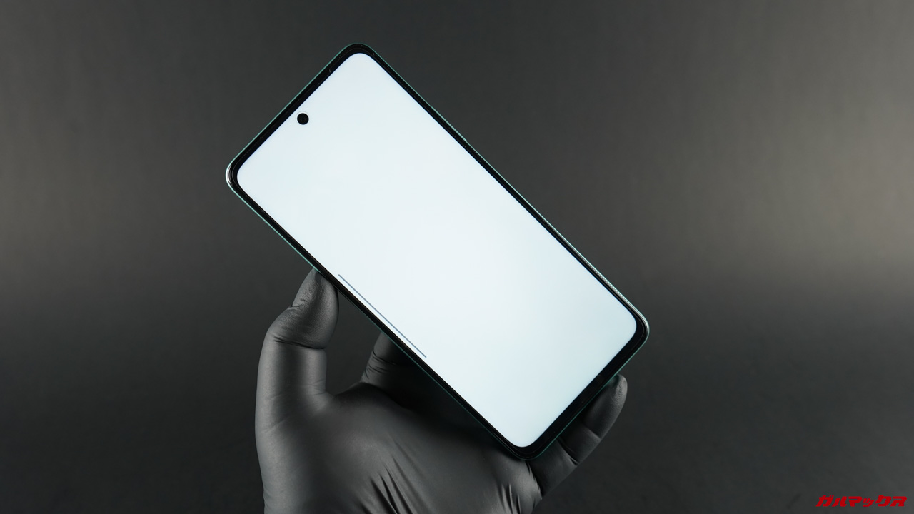▼ベゼルはそこそこ太くてパンチホールもデカめ。あぁ、安価なスマホだなって感じがした。↓