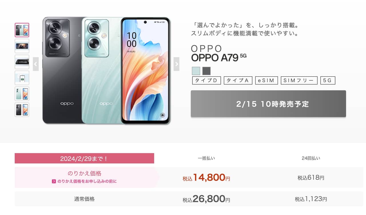 IIJmioでOPPO A79 5Gは2024年2月15日10時から発売。通常価格は26,800円、MNPだと14,800円です。
