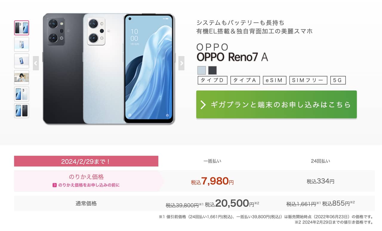 ▼というのも、同じOPPOの一つランクの高いミドルレンジスマホ「OPPO Reno7 A」がまたドエライ割引をやってる。↓