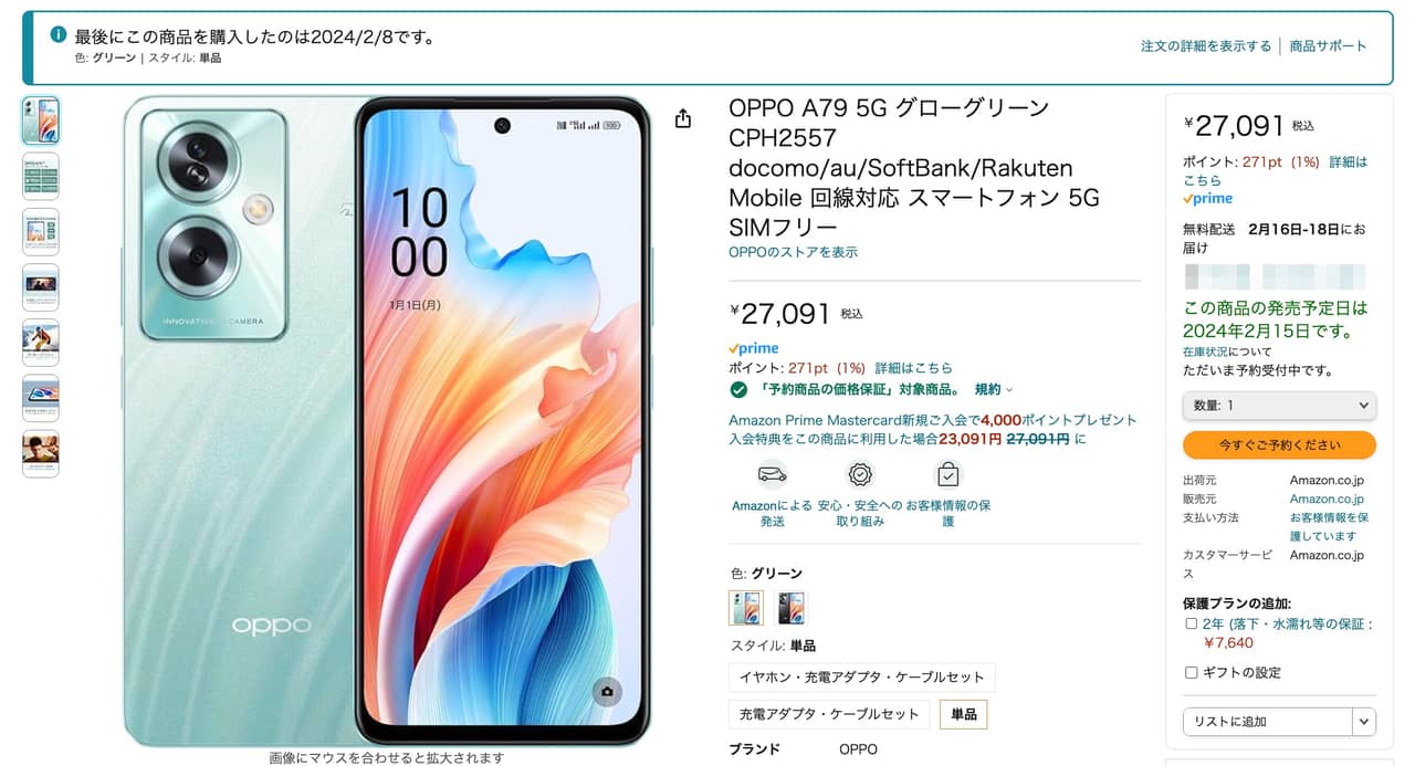ちなみにOPPO A79 5Gの価格は執筆時点でAmazonだと27,091円でした。