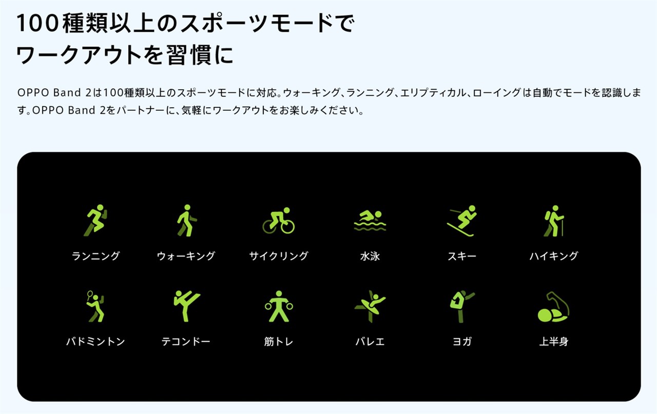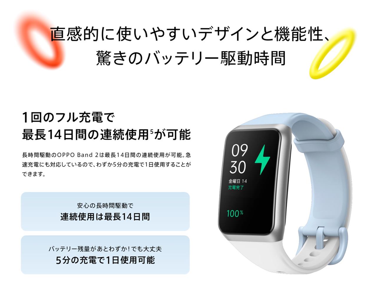 OPPOが日本向けの新型スマートバンド「OPPO Band 2」を発表!1時間でフル充電できて14日も持つ電池持ちの良さ、1.57インチとスマートバンドの中でも大画面の有機EL搭載で105種類のスポーツモード対応のモデルです!
