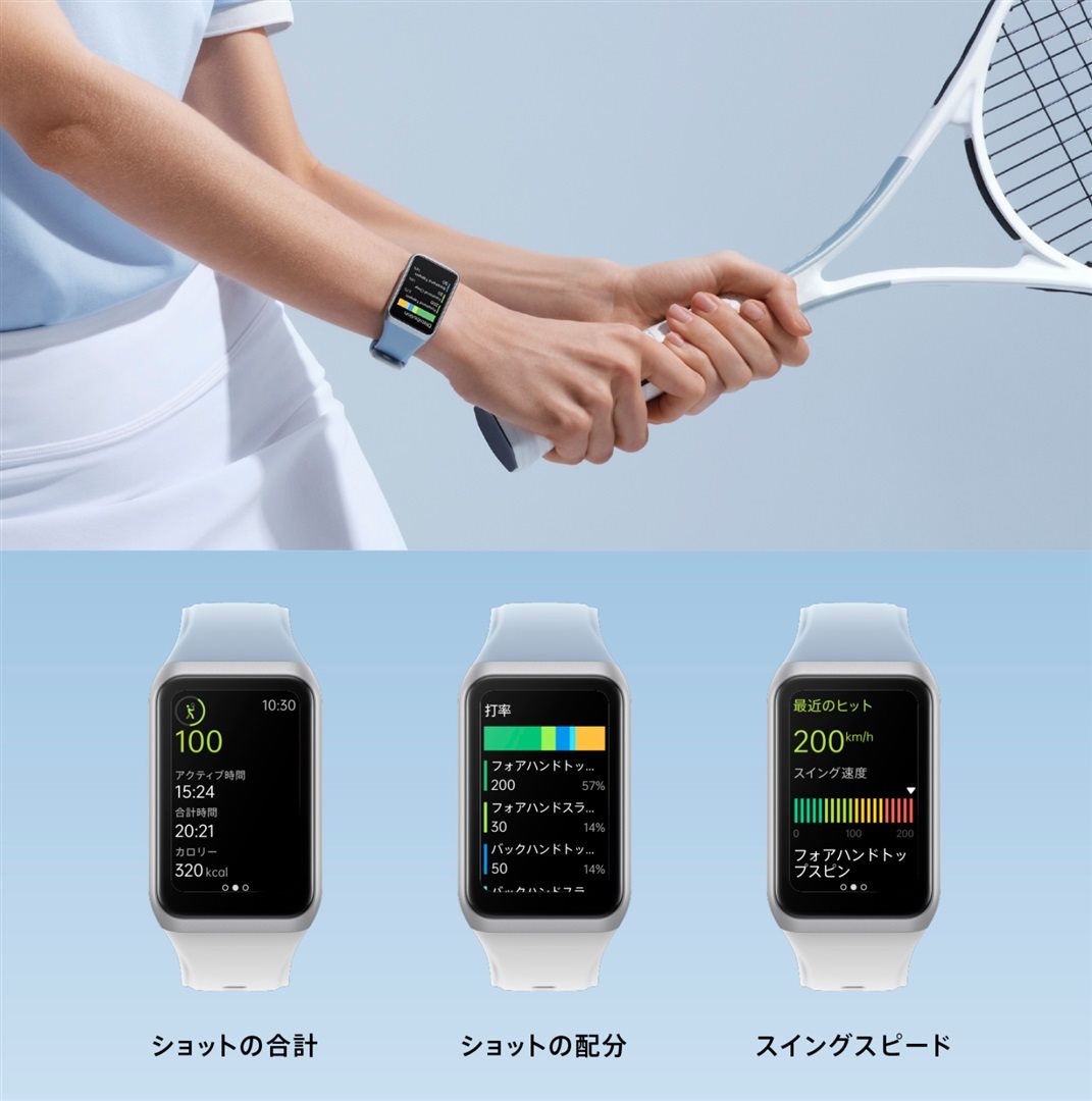 ▼またこのOPPO Band 2、6軸モーションセンサーを内蔵したことでより細かい動きを検出できるようになっています。なんとテニスではラケットのスイングも測定できるようになっているのが特徴!↓