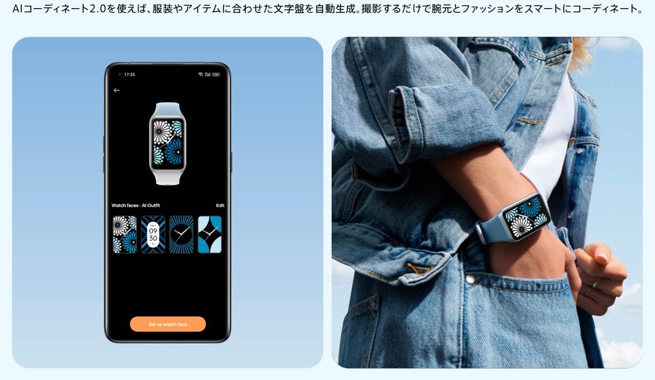 ▼またOPPO特有の機能として、撮影した服の写真からカラーを抽出し、それを文字盤デザインにすることで、ファッションに合わせられるのも魅力!↓