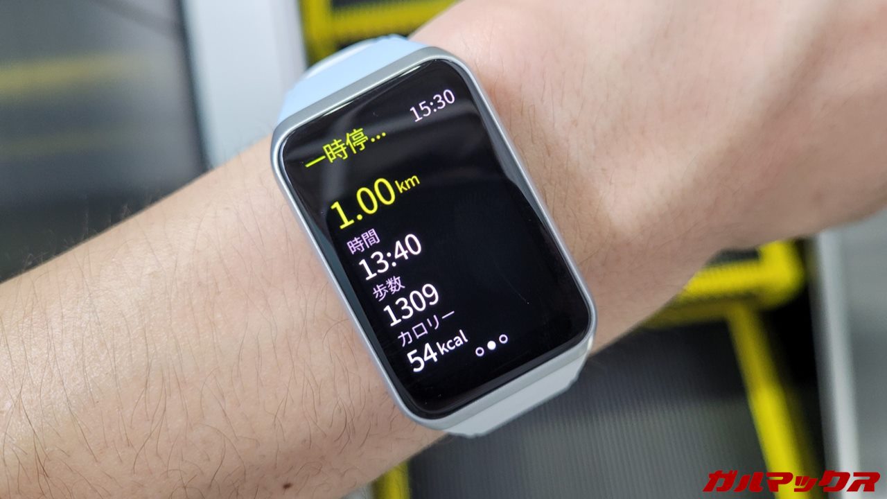 ▼ウォーキング、ランニングでは立ち止まると自動で一時停止してくれるんですが、その反応も◎。駅まで歩いて、エスカレーターに乗ってすぐに一時停止してくれてました。すげーなこれ。でも「一時停止」の文字は最後まで表示してくれ。↓