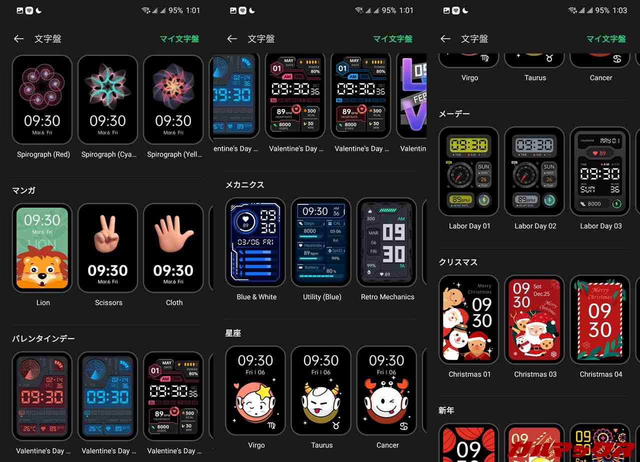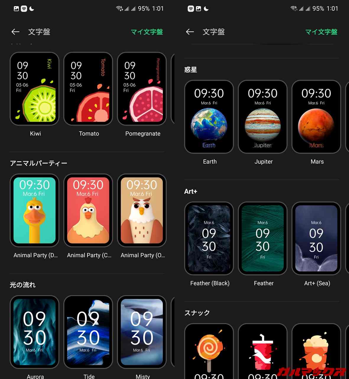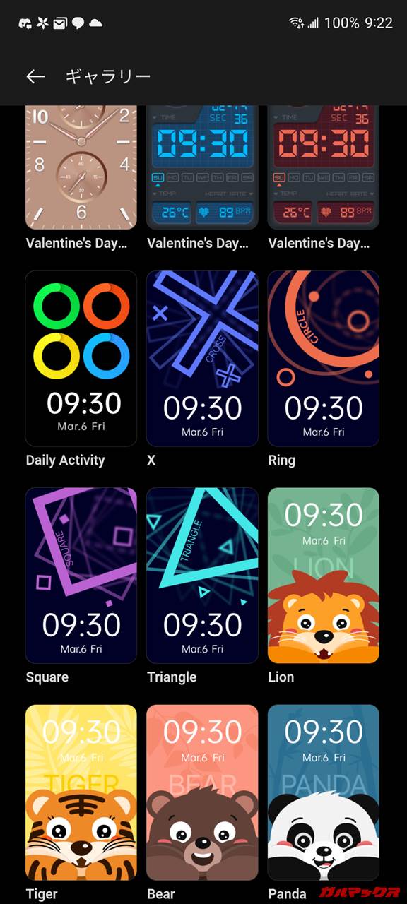 ▼なお文字盤デザインは100種類以上とかなり多いのも魅力。OPPO Watch Freeでは40種類と少なくそのせいで飽きやすいんだけど、OPPO Band 2はまったくそんなことなかったぜ!しかもデジタル感・ガジェット感あふれるものも多くて満足。↓