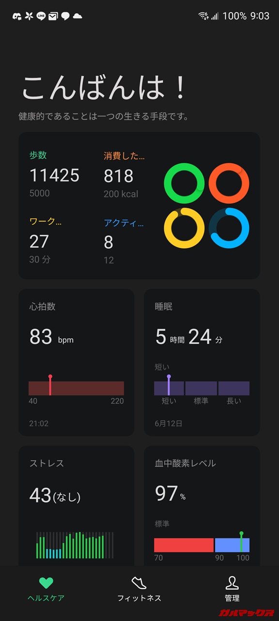 ▼アクティビティセッション回数(椅子から立って動いた回数と思われる)とストレスの度合いも表示されました。↓