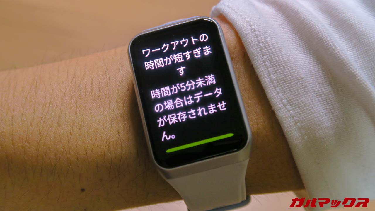 ▼ちなみにワークアウト時間が5分以内の場合ワークアウトとはみなされずデータは保存されません。注意書きが出てきます。↓