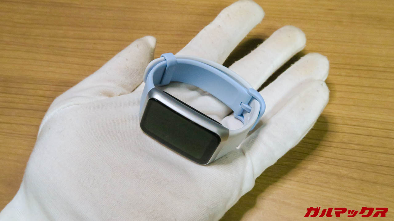 ▼スタイルとしてはシンプルなスマートバンドのそれ。側面に物理ボタンは無く、本体自体のカラーはつや消しの銀色となっとります。↓