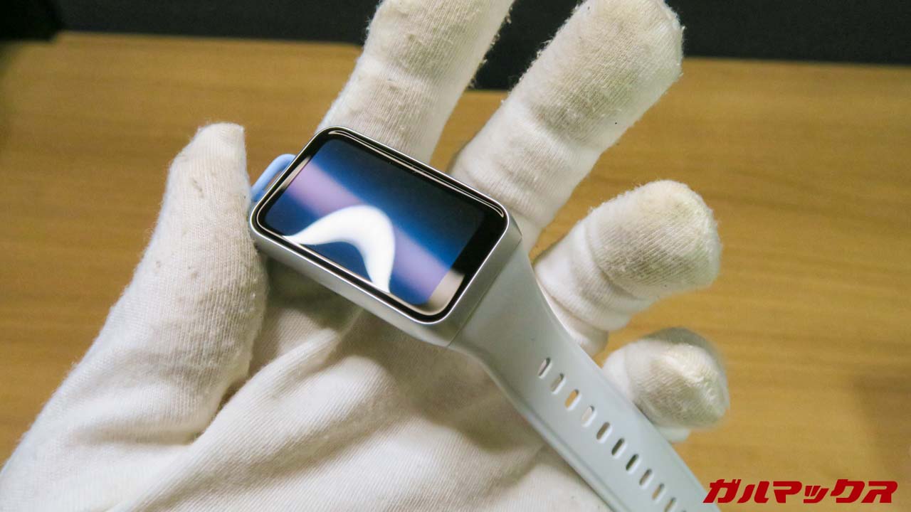 ▼またディスプレイはわずかながら曲面を描いていました。この点はOPPO Watch Freeの遺伝子を受け継いでいる、という印象。↓