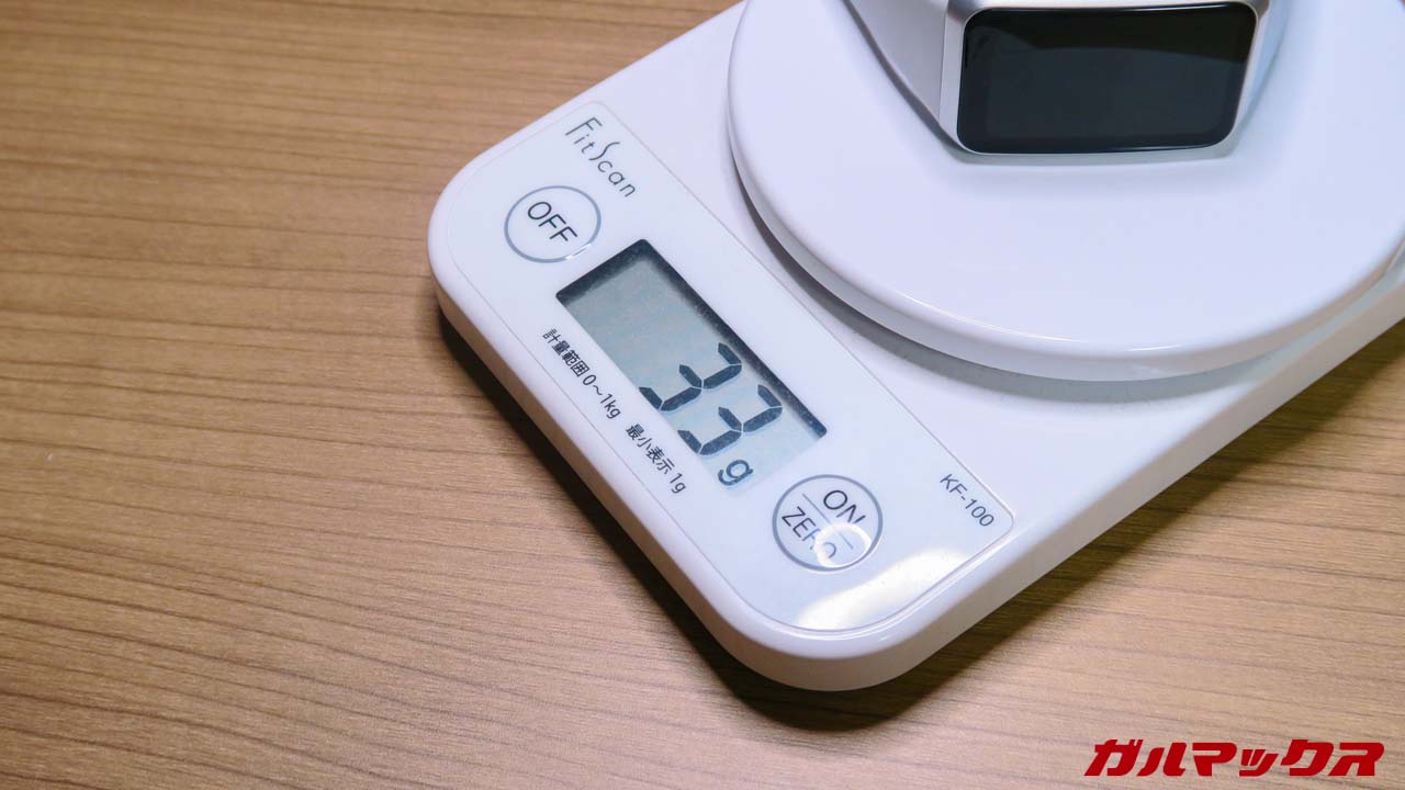 ▼重量の実測値、33gでした。細長かつ軽量なので装着性は非常に快適レベル。↓
