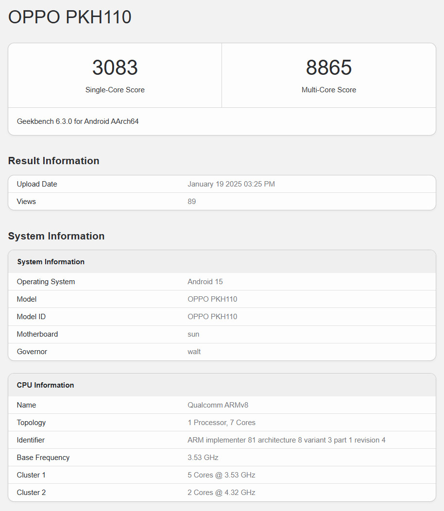 スマホの性能を数値化するベンチマークスコアの大手であるGeekBenchに、OPPO PKH110が登録されました。