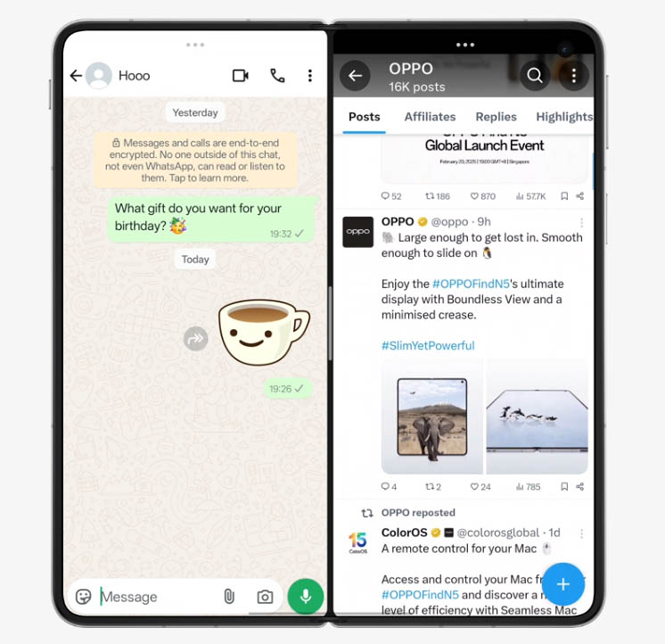 でもFind N5なら大画面を活かして複数アプリを起動しても操作しやすいでしょう。資料見ながら連絡したり、調べながらメモに書いたり、ゲームをオートプレイしながらもう一つゲームをやったりなど、楽しみ方は無限大です。