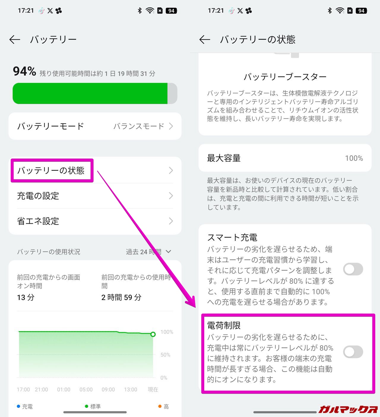 バッテリーは満充電まで行うと劣化が早まると言われていて、最近はいろんなスマホで「満充電しない充電制限」の機能が搭載されてます。