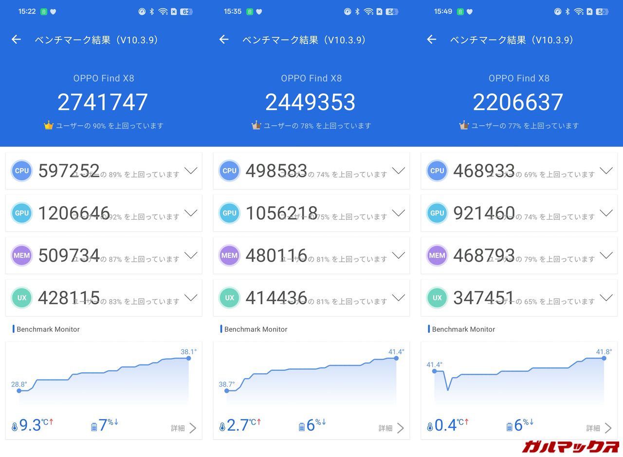 ▼例えばAnTuTuを3回連続で走らせると熱は結構出るし当然スコアも下がります。でも3回目の結果でも200万点は軽く超えているから相当なハイパフォーマンスを維持できているとも言えますねぇ。↓