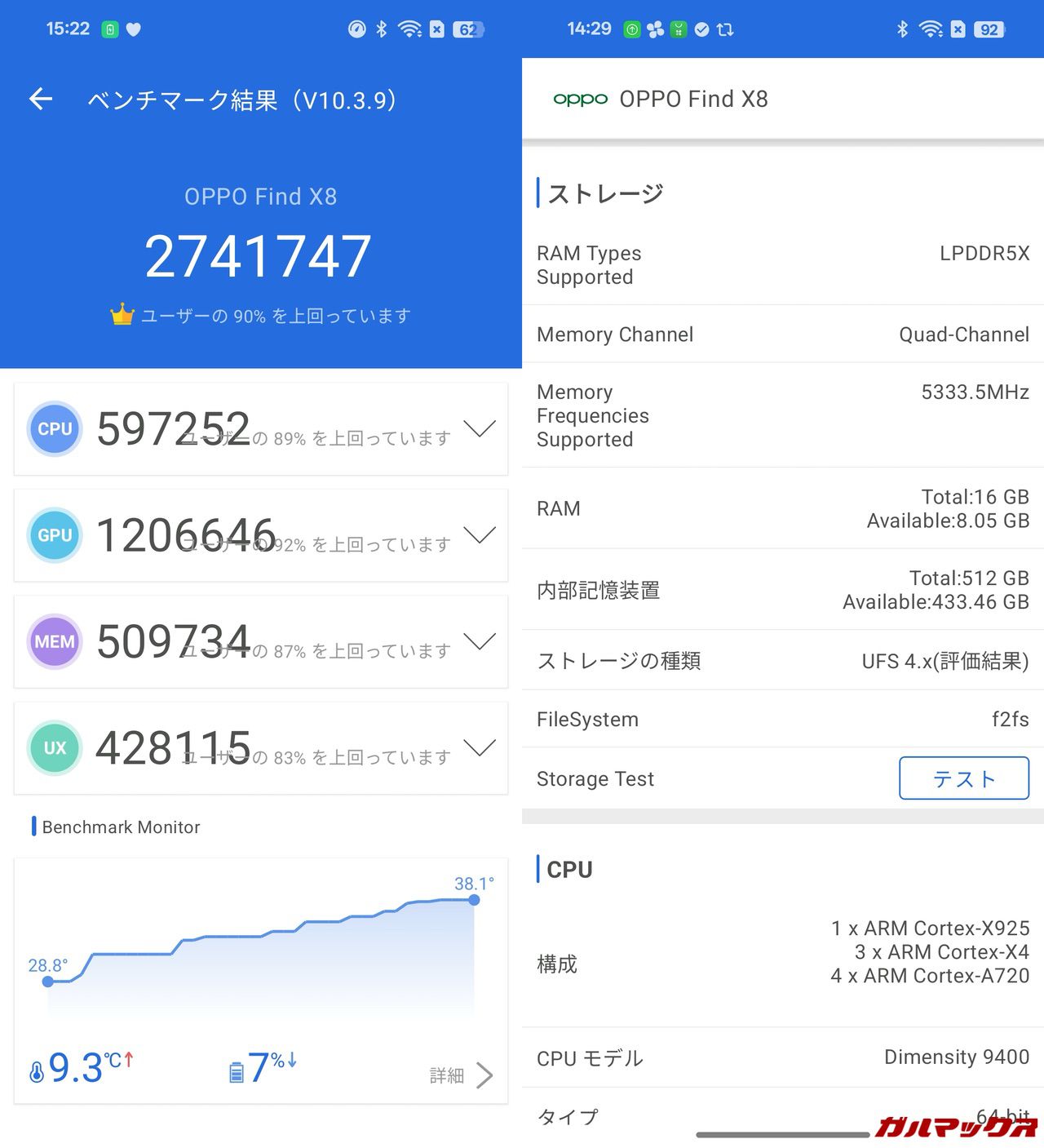 実際に操作した感覚としては、ミドルハイと比べてヌルサク感はやっぱり別次元。このクラスになるとSoCだけじゃなくメモリもストレージも超速いので、体感としてのヌルサク感は違いますねぇ。普段の操作もめちゃくちゃ快適。