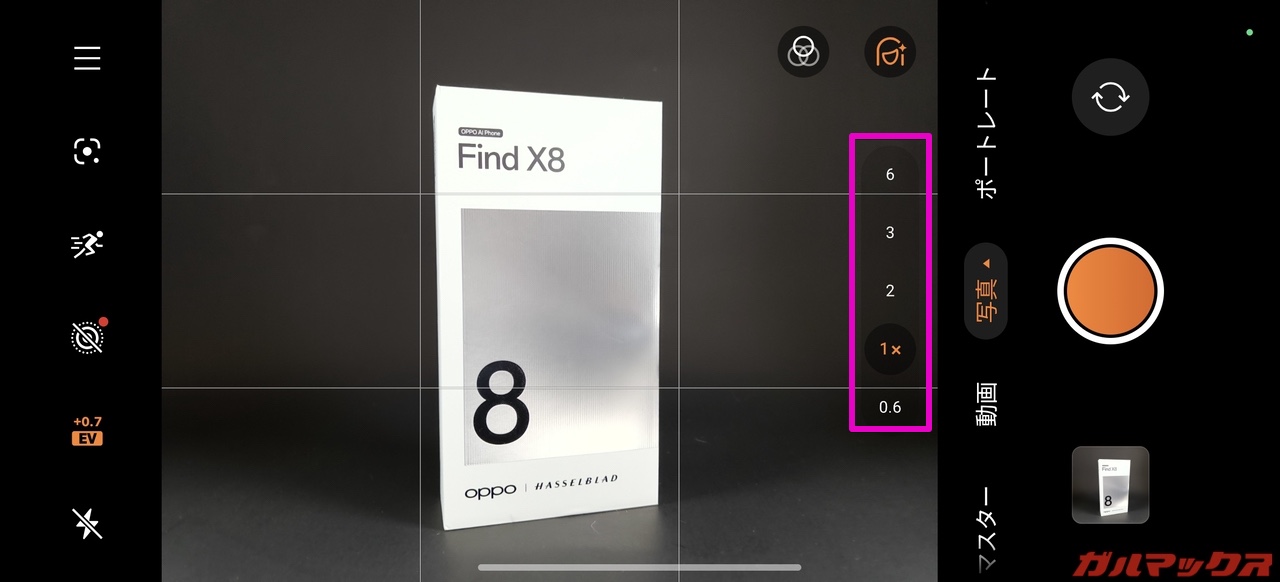 ▼0.6倍、1倍、2倍、3倍、6倍にワンタップで切り替えられるのも◎。このパパッと切り替えられる5つの倍率が日常使いで実に使いやすいです。↓