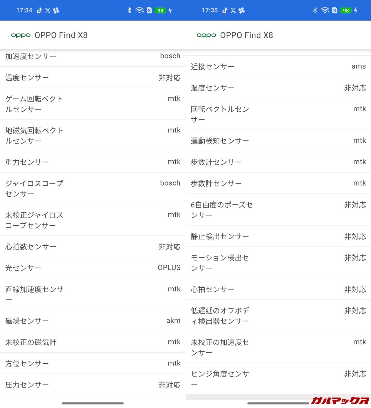 大体のスマホは5,000mAhくらいの容量なんですけど、OPPO Find X8は5,630mAhと容量がかなり多めなので、実際の駆動時間も長い感じですねぇ。それにしてもスタンダードスマホで5,500mAhオーバーのバッテリーを搭載するなんて、すごい時代になったもんですな。