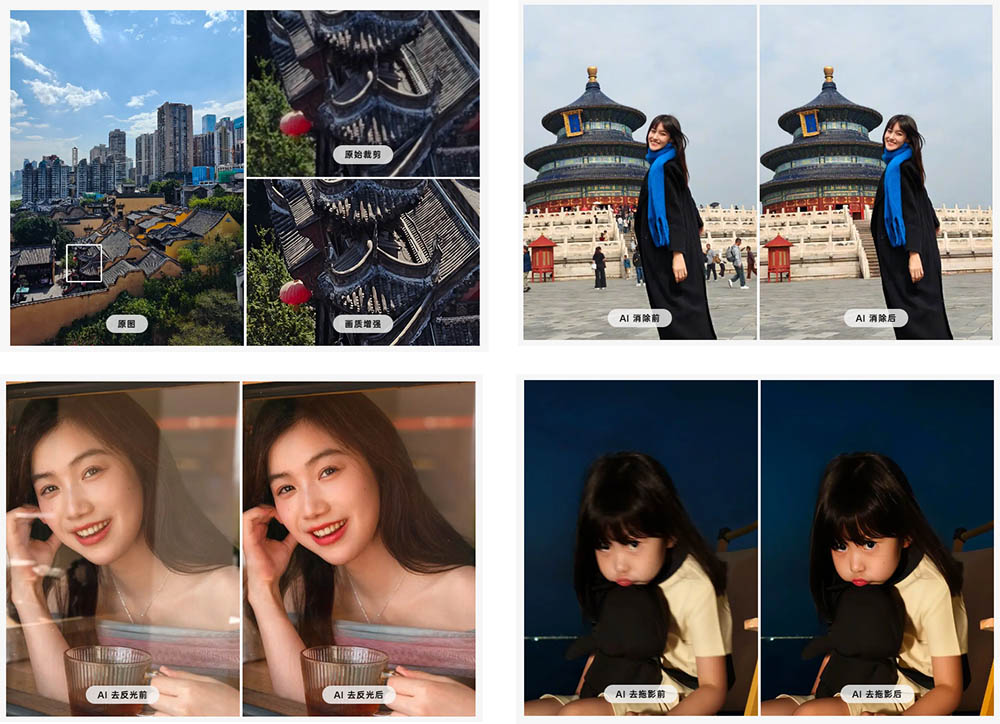 ▼その他鮮明度強化、消しゴム、反射除去、ボケ除去などのAI画像編集機能も搭載しています。↓