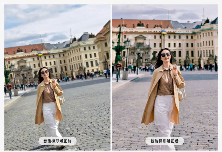 ▼スマート台形補正。画面の黄金比を復元し、写真の「奇妙な角度」を自動補正してくれます。↓