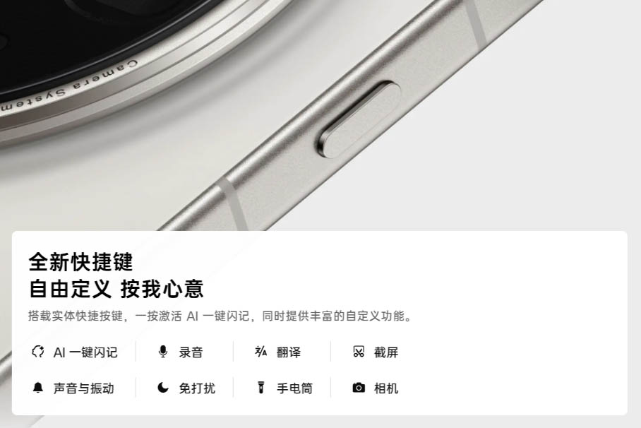▼本体左側面にはショートカットボタンを搭載。所謂アクションボタン。AIの起動やカメラ、ライト、翻訳、スクリーンショットなどの動作を割り当てることができます。↓