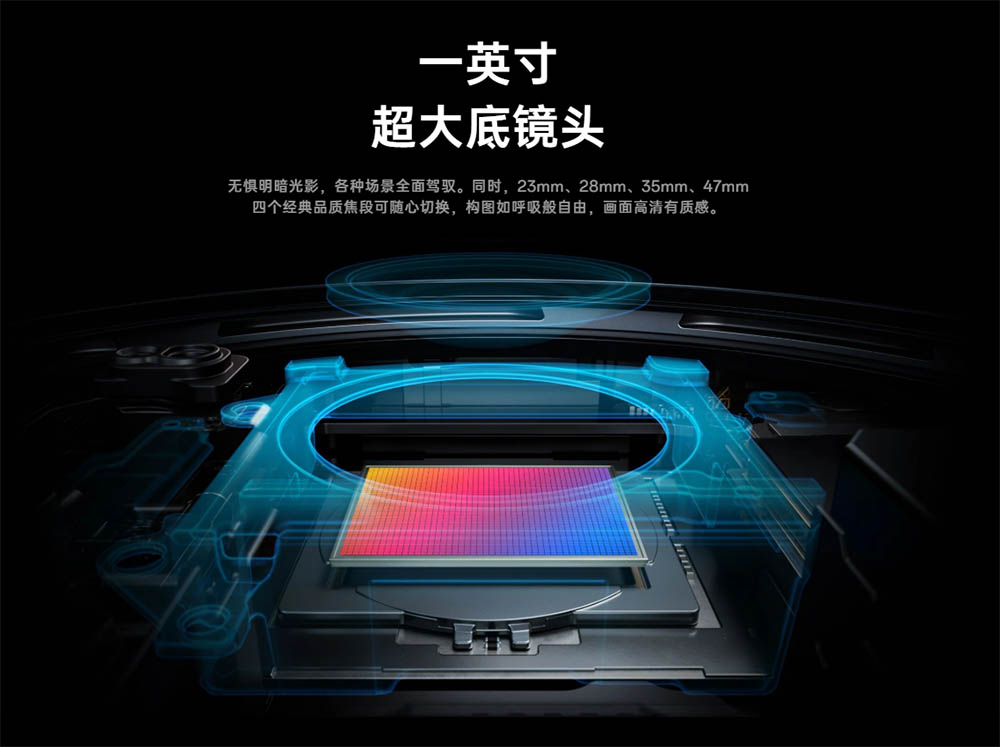 ▼メインカメラには1インチの大型センサーを搭載。23mm、28mm、35mm、47mmの焦点距離を切り替える事ができます。↓