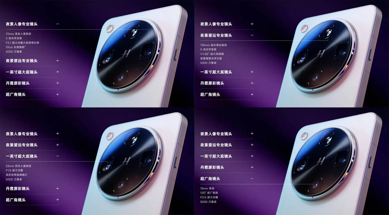 ▼50MP(広角)+50MP(超広角)+50MP(70mm望遠)+50MP(135mm望遠)のクアッドカメラ構成。↓