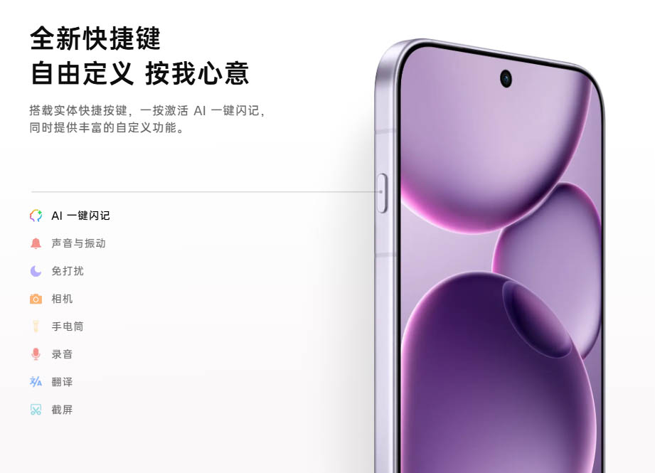▼本体左側面にはアラートスライダーの代わりにショートカットボタンを搭載。AIの起動やカメラ、ライト、翻訳、スクリーンショットなどの動作を割り当てることができます。↓