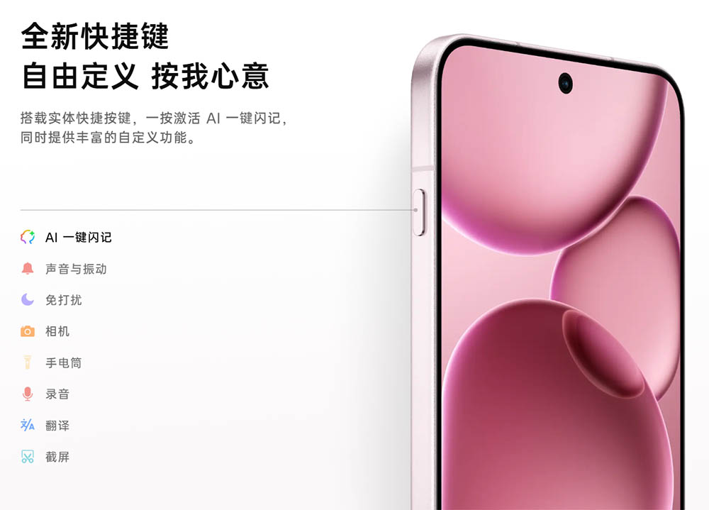 ▼本体左側面にはショートカットボタンを搭載。所謂アクションボタン。AIの起動やカメラ、ライト、翻訳、スクリーンショットなどの動作を割り当てることができます。↓