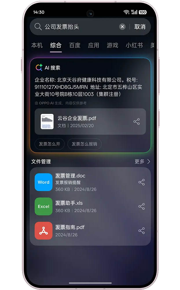 ▼グローバル検索。端末内のファイル、カレンダー、連絡先などを総合検索できる機能。グローバル検索自体は以前のバージョンのColorOSにも搭載されていましたが、AI搭載でさらに賢くなったようです。↓