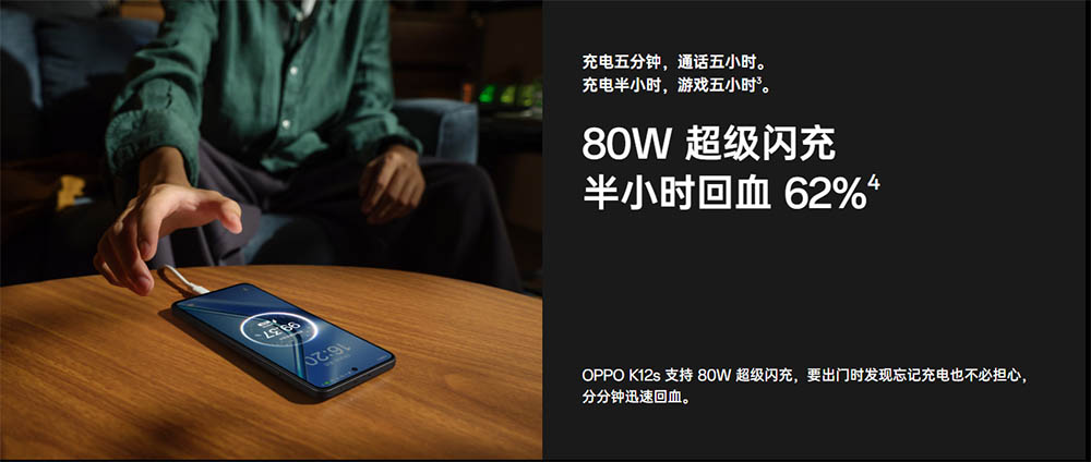 ▼急速充電規格は80W(SUPERVOOC)をはじめ、80W(自社UFCS)、44W(サードパーティUFCS)、33W(PPS)、13.5W(PD、QC)にも対応しています。80W(SUPERVOOC)で充電した際は30分で62%の充電が可能だそう。↓